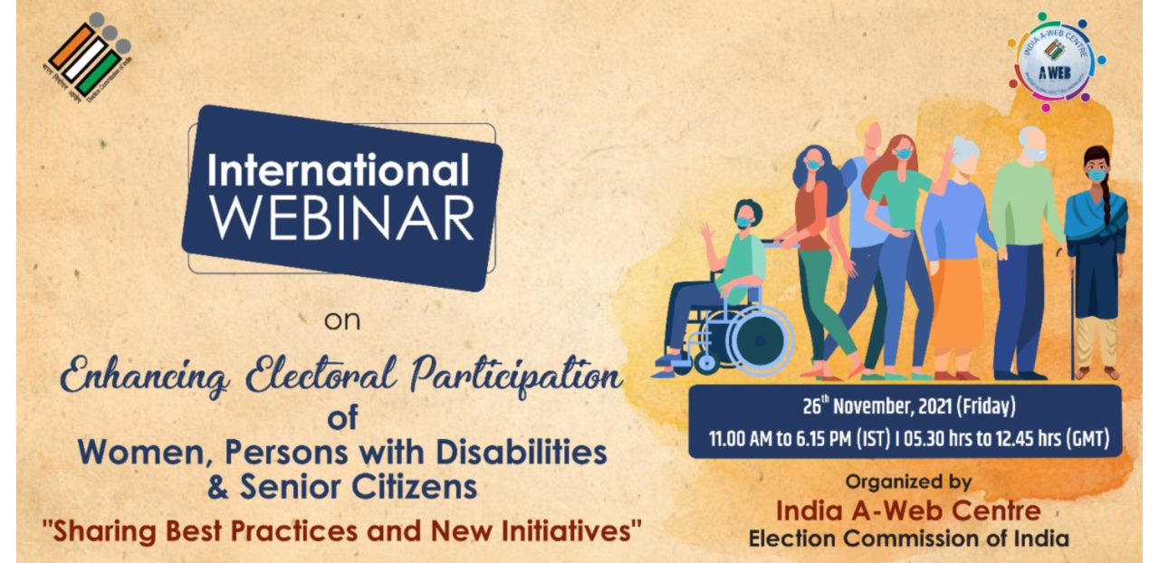 Theme: Enhancing Electoral Participation of Women, Persons with Disabilities (PWDs) and Senior Citizens: Sharing Best Practices and New Initiatives Date: 26th November, 2021 (Friday) Time: From 11:00hrs-18:15hrs. (Indian Standard Time)(GMT: 05.30 hrs to 12.45 hrs.)